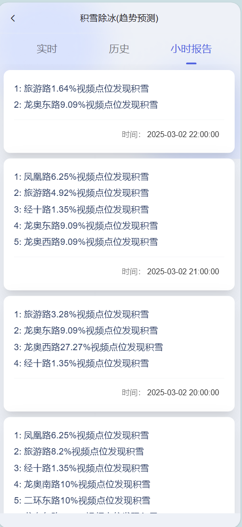 為應(yīng)對此次暴雪天氣,工作人員提前進行周密的部署,密切監(jiān)控全市的雨雪情況。11點20分,數(shù)算法全要素融合調(diào)度平臺下發(fā)路面積雪識別算法任務(wù),將積雪識別算法與全市92個關(guān)鍵路段、886個視頻點位,以及1185個主次干道路視頻監(jiān)控點位進行精準(zhǔn)綁定。隨后,數(shù)算法全要素融合調(diào)度平臺利用積雪識別算法,以每分鐘一次的頻率對所有視頻點位高效識別,實時監(jiān)測道路積雪情況。僅12點12分,平臺便產(chǎn)生第一條積雪報警信息。截至3月3日凌晨2點,平臺對綁定積雪算法的視頻點位進行了高達99.2萬次的識別,成功推送了1157條積雪報警信息至市長端APP,為決策者提供了有力的數(shù)據(jù)支撐。