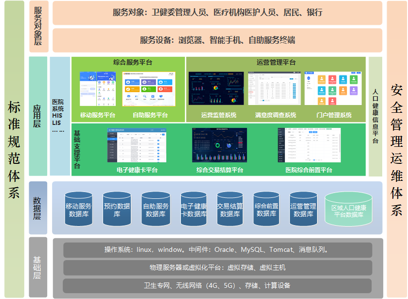 基礎(chǔ)支撐平臺:電子健康卡管理系統(tǒng)、電子健康卡注冊管理系統(tǒng)、跨域主索引系統(tǒng)、用卡監(jiān)測系統(tǒng)、醫(yī)療服務(wù)統(tǒng)一接入平臺、聚合支付集成系統(tǒng)、結(jié)算賬務(wù)管理系統(tǒng)、支付綜合監(jiān)測系統(tǒng)